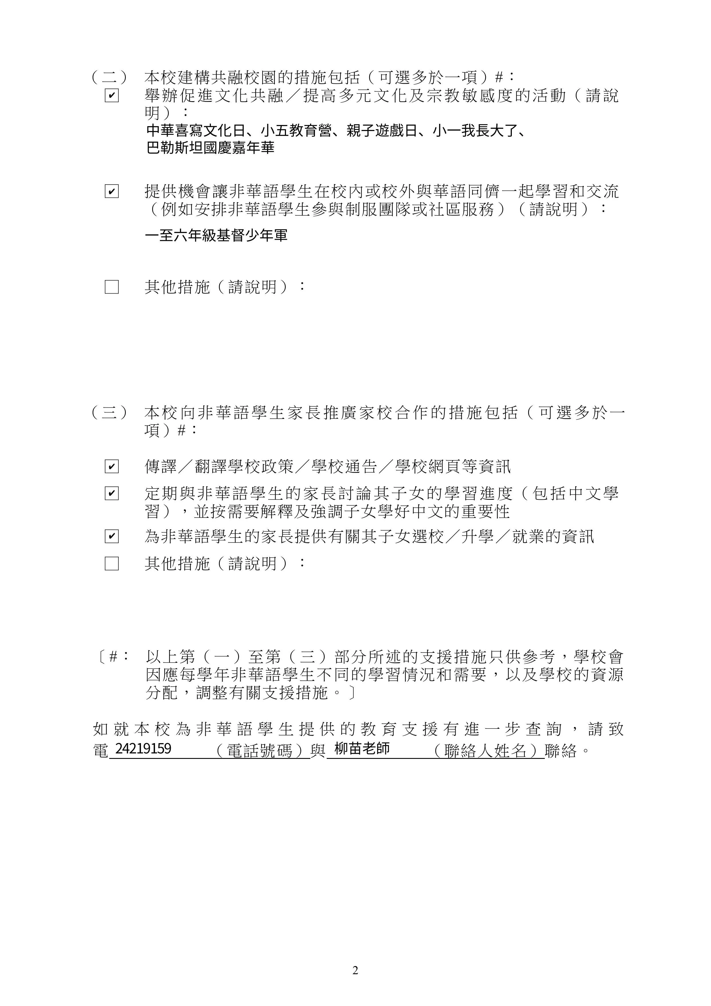 本校透過不同方面的支援為非華語學生提供多方面的協助,並提供一個種族平等的學習平台,故本校被平等機會委員會選為「支持種族友善校園」,相關支援包括: