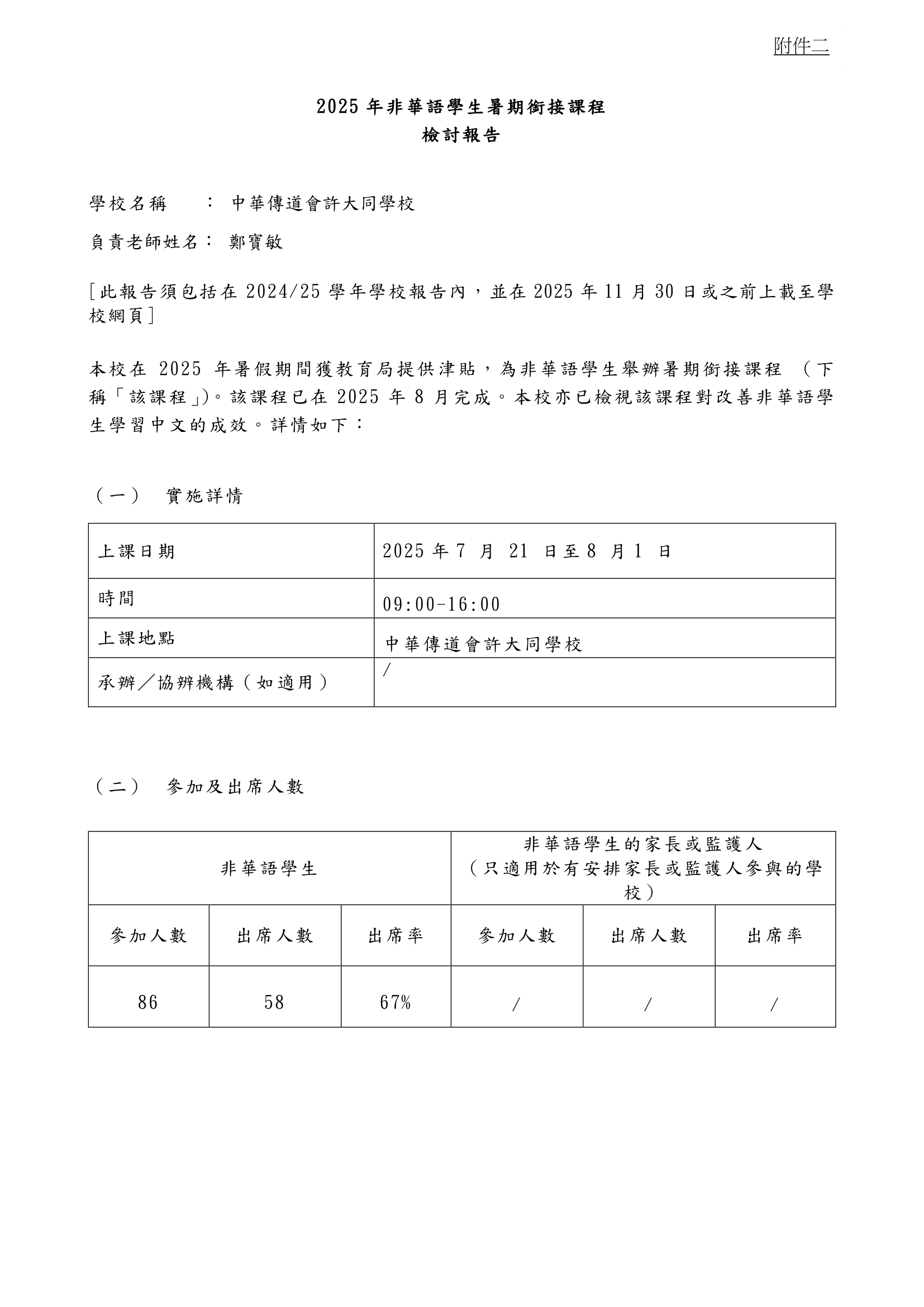 本校在暑假期間開辦「暑假銜接課程」,協助由幼稚園升小一的非華語學生適應小學的中文主流課程,亦幫助新來港或轉讀本校的非華語學生銜接本校主流課程。本校的非華語學生亦會參與「暑假銜接課程」,幫助他們鞏固所學及銜接新一個學年的中文課程。